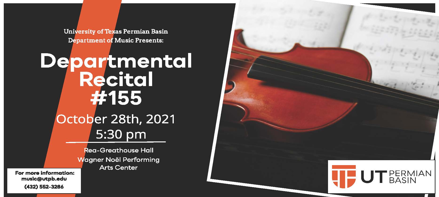 Music@UTPB presents Departmental Recital #154 | October 18, 2021 @ 5:30PM | Rea Greathouse Hall at Wagner Noel Performing Arts Center